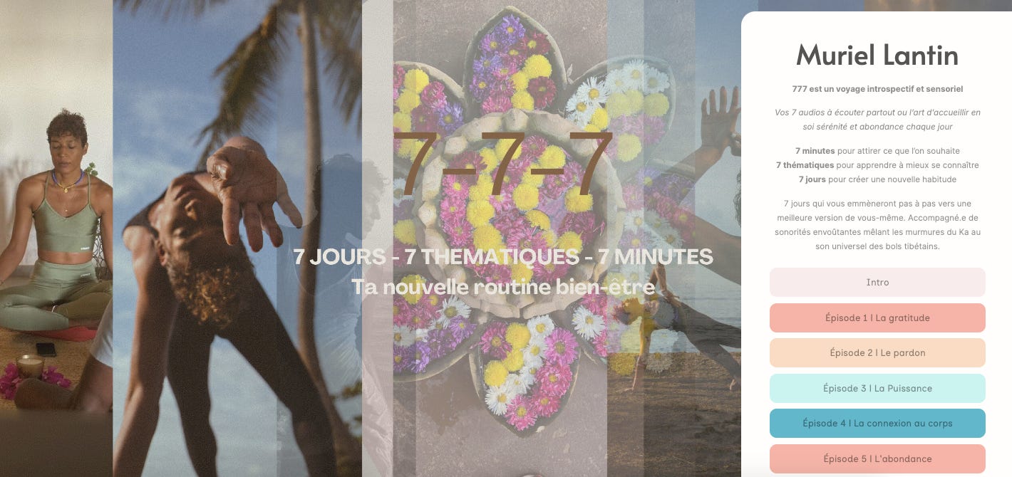 Muriel a eu une idée : créer un voyage méditatif. Il s’agit d’un programme de méditation composé de 7 audios de 7 minutes pour 7 jours (le 7-7-7).