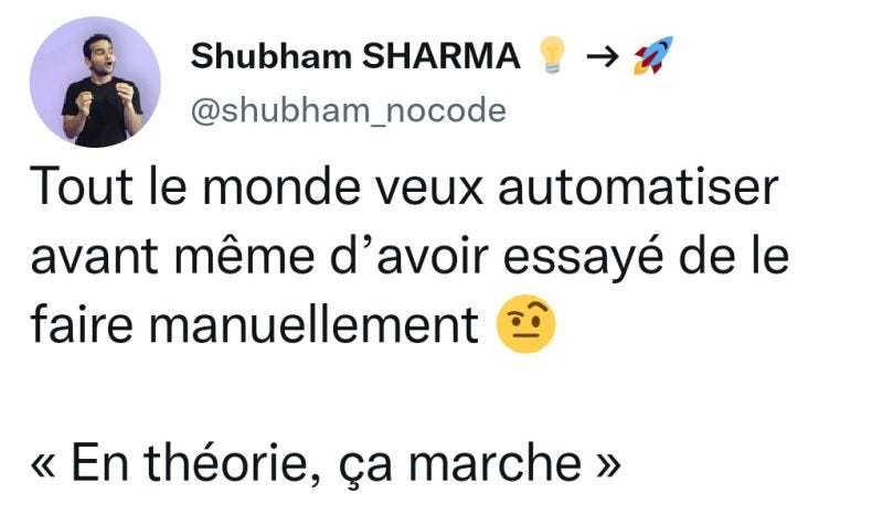 On automatise un process qui fonctionne déjà manuellement. C’est justement en réalisant ses tâches manuellement qu’on peut matérialiser ses process et comprendre ses besoins. Le besoin d’automatiser se fait ressentir quand le process devient chronophage, donc cette étape ne peut pas être ta priorité.